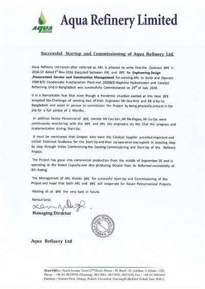 近日,由北京石油化工工程有限公司負責設計及部分采購工作的孟加拉項目(2500B/D凝析油蒸餾裝置和1500B/D半再生重整裝置)業(yè)主AQUA Refinery公司發(fā)來感謝信,對我公司在項目設計、建設方面做出的努力給予了高度肯定和贊揚,并對在孟加拉國新冠疫情爆發(fā)時期,為配合項目試車工作我公司派出的兩位專家表示感謝。