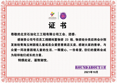 近日,北京石油化工工程有限公司收到中華少年兒童慈善救助基金會眾愛專項(xiàng)基金捐贈證書。感謝公司在"金秋助學(xué)"活動中為困難兒童慷慨解囊做出的善舉。