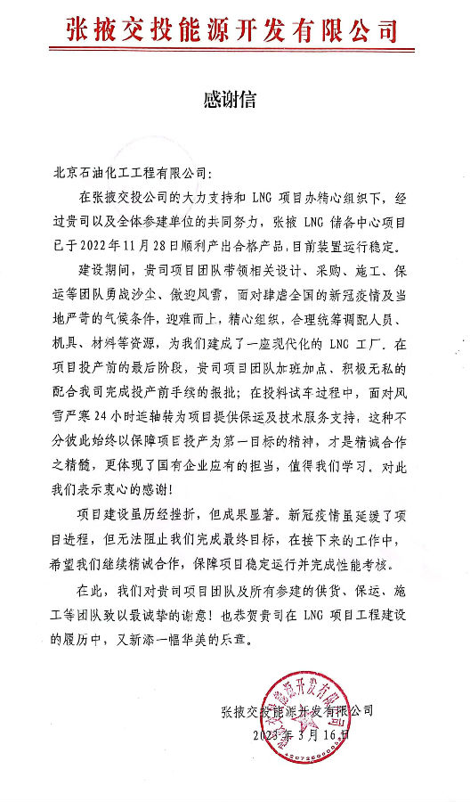 近日,北京石油化工工程有限公司(簡稱:北油工程)收到張掖交投能源開發有限公司發來的感謝信,對張掖LNG儲備中心項目建設成果表示了肯定,對我公司項目團隊表現出的技術專業性及不畏艱難、勇于擔當的團隊精神表示了感謝。
