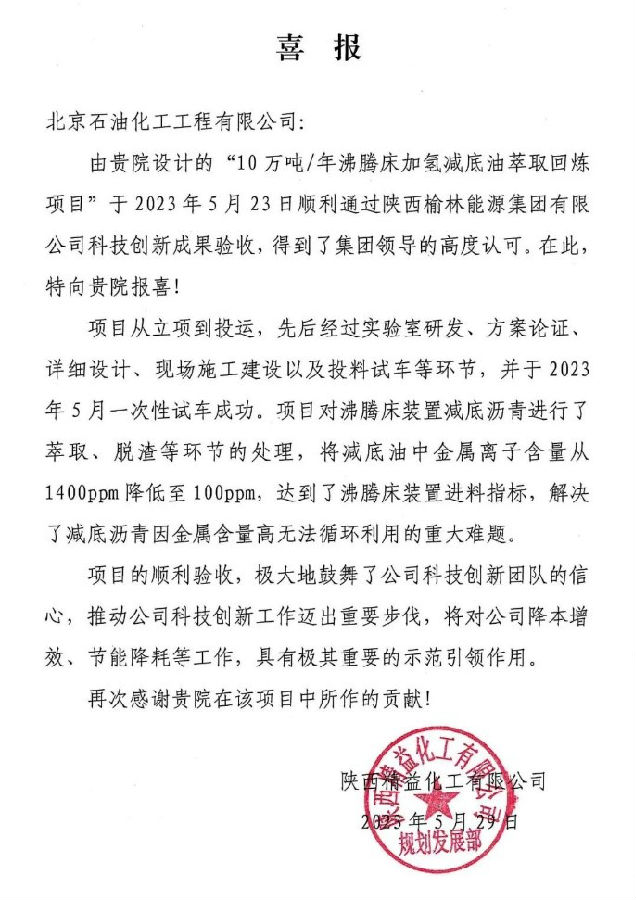 近日,由北京石油化工工程有限公司設計的陜西精益化工10萬噸/年減底油萃取回煉項目開車成功并通過業(yè)主驗收,得到業(yè)主的高度認可。該項目以沸騰床煤焦油加氫裝置的減底油渣為原料,回收其中可重復利用的組分,并將油渣中的膠質(zhì)/瀝青質(zhì)及金屬離子含量控制在一定范圍內(nèi),從而滿足沸騰床回煉的進料要求,為焦油加氫企業(yè)處理未轉(zhuǎn)化的油渣提供了一條全新途徑,大幅提升了企業(yè)經(jīng)濟效益。(通訊員/韓金奇)