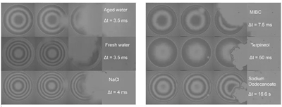 圖2. 不同溶液中疏水表面退潤濕所需時間(視場大?。?84×384 μm)
