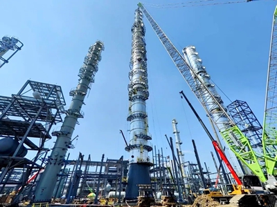乙醇塔是本項目核心設(shè)備,直徑4.8米,高度116米,總重380噸,分4段進場組對。尤其最后吊裝的上段設(shè)備長達25米、重達126噸,吊裝難度大,精度要求高。面對場地條件受限、惡劣天氣等不利因素,項目組與各參建方精心策劃、周密部署,通過科學管理,在38天窗口期內(nèi)高效完成包括超高、超重塔器及反應(yīng)器的安裝,為項目的全面推進創(chuàng)造了有利條件。